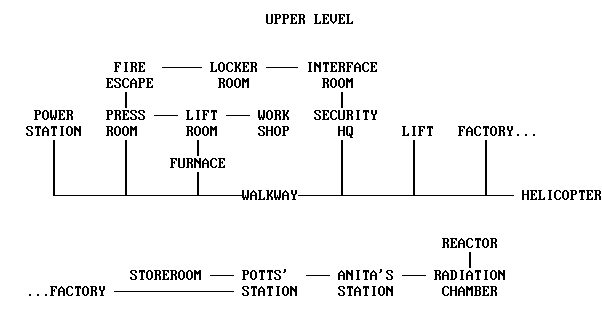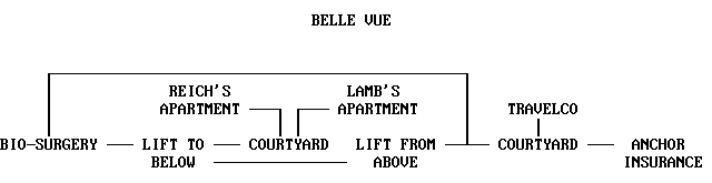 Simultaneously press the left button, then wait for the man to leave. Use the switch at the upper right of the control panel to turn off its light bulb, then pick up the bulb from the socket at left. Put the putty in the light socket and operate the switch again to open the left panel. Use the left-hand switch, then the right-hand one. Exit the room and move two screens right to the down elevator outside the factory entrance. Put the ID card into the elevator slot (a process you'll have to repeat whenever you want to use an elevator). Enter the elevator and descend to the Belle Vue level. Grab the red cable, then move one screen left. Enter the courtyard at upper right and use the ID card to open the left-hand door to Reich's apartment. Enter the apartment and get a magazine under the pillow. Exit the apartment and courtyard and move two screens right to the Man and Machine sculpture. Enter Travelco and give the magazine to the clerk: