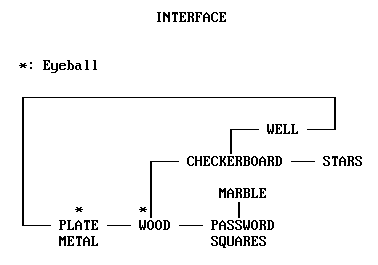 Exit right to the wood zone. Use BLIND on the eyeball, then immediately exit north to the checkerboard zone. Exit right to the stars zone. Use OSCILLATOR on the crystal and pick up the helix (VIRUS). DISCONNECT.